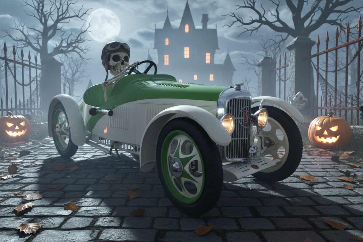 C’est bien ici ma Panhard Grand-Prix qui surgit dans la nuit d’une ambiance lugubre… Hououououuououou ! ! ! Hououououououou ! ! ! Comme le veut la tendance pour attirer les gamins d’aujourd’hui.